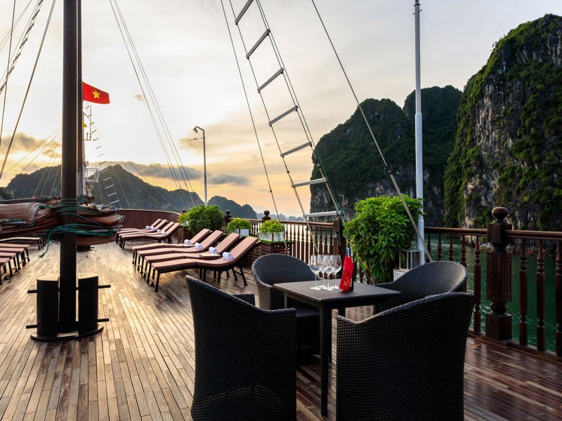 Leisure yourself with our happy-hour drinks at the bar. Overnight on Alisa Cruise near Surprising Cave, the quietest sleeping area permitted by Halong Governmental Authority.