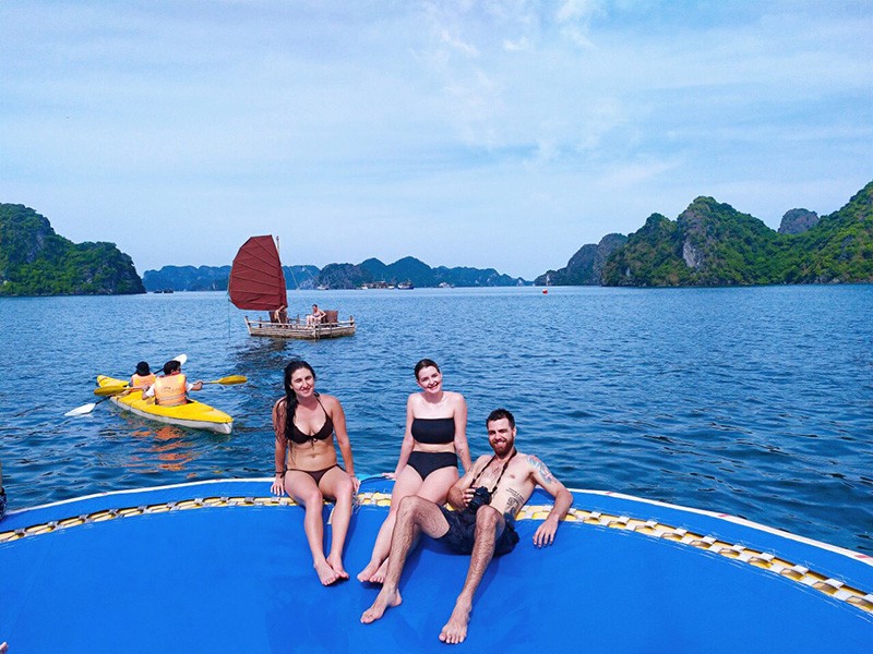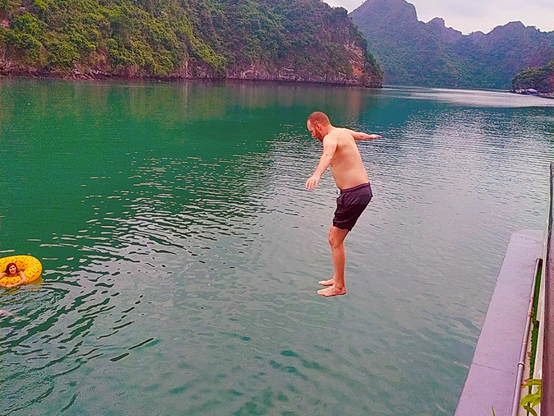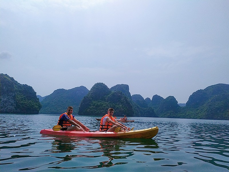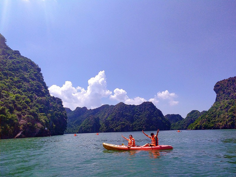 12:15pm: Arrive Ong Cam area, situated on the border of Ha Long Bay and Lan Ha Bay - south side of Hạ Long Bay, this is the best choice for kayaking (or bamboo boat), photo hunts, with the all four sides enclosed by vertical cliffs (with dry bag).