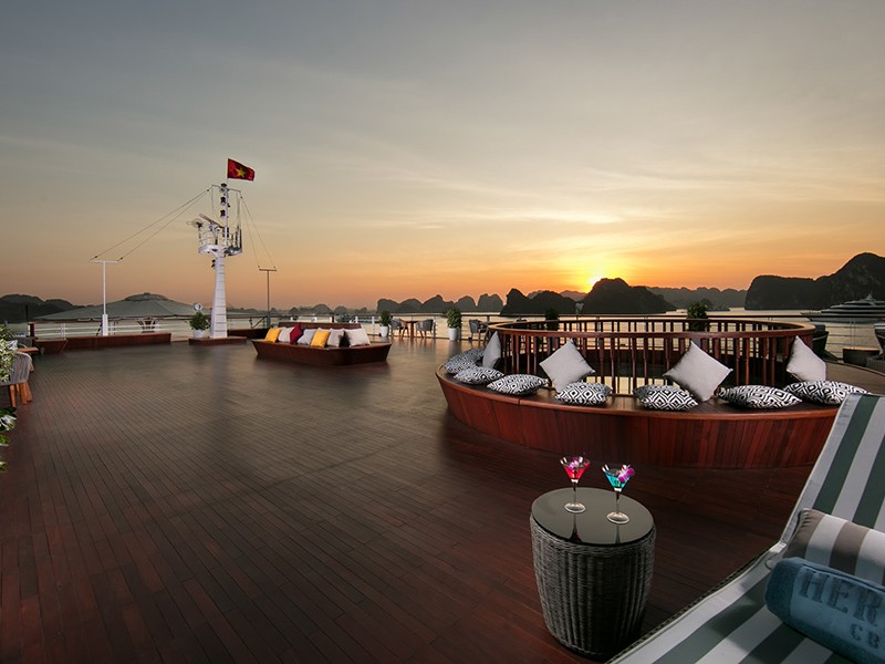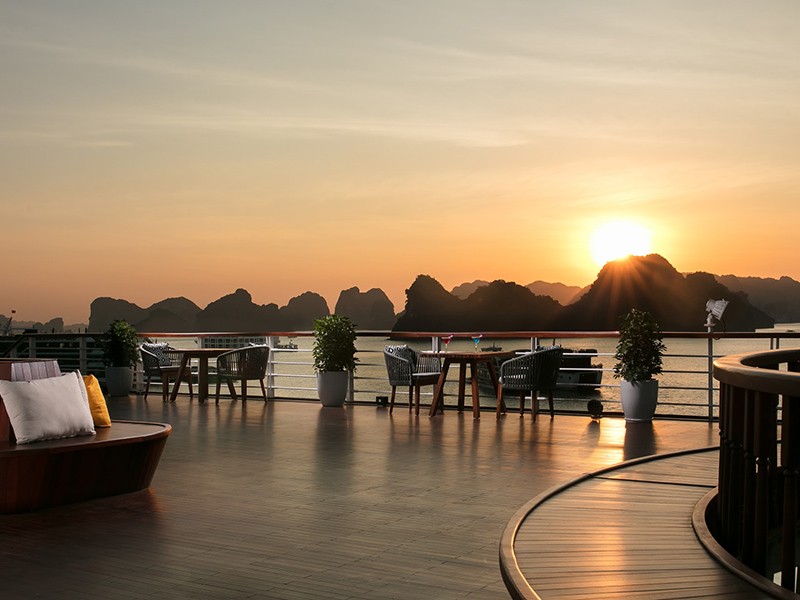 17:30 Back on Heritage Cruises, enjoy life aboard the vessel or in your suite, and with cocktail in hand watch the sunset over the Gulf of Tonkin.