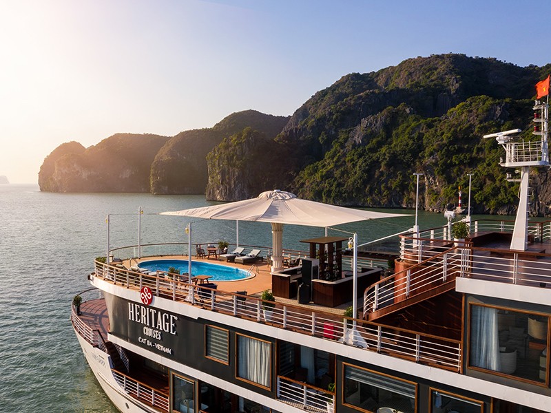 Heritage Cruises offers authentic experiences for 40 guests aboard an architecturally designed boutique river and ocean cruise ship in the Gulf of Tonkin. Amenities include a spa, outdoor lounge, pool and 20 suites with picture windows offering river and ocean views.