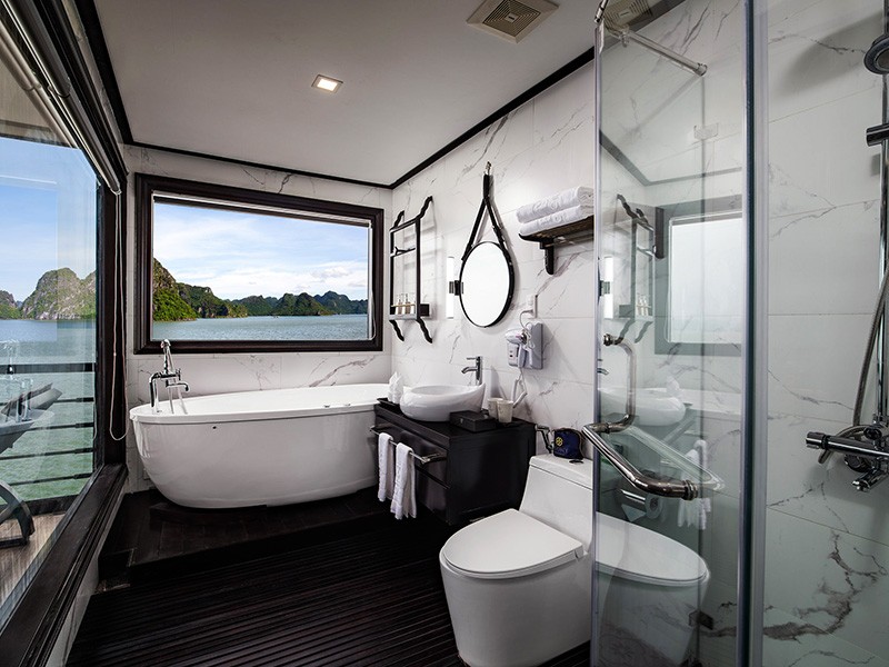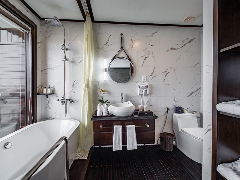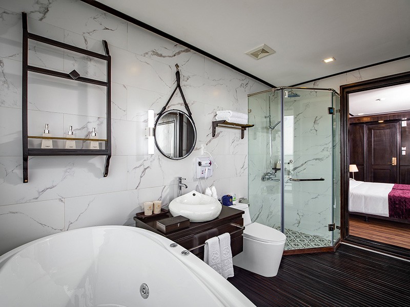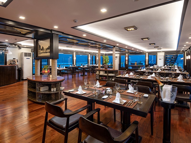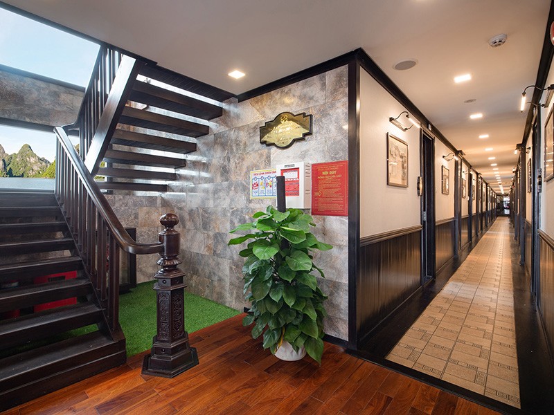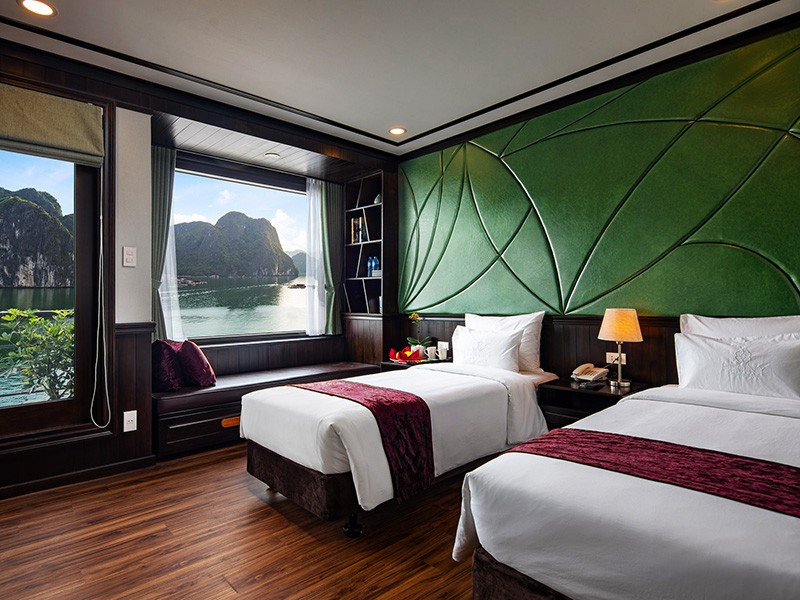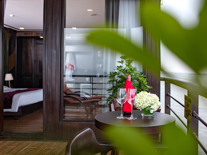 These luxurious cabins are situated on the first floor with private balcony where lovely views of the legend bays are appeared in your eyes once you get into the cabins. You absolutely are impressed the luxurious facilities and the modern convenience amenities of cabins. Also passengers are supplied the excellent cabins with charm, cleanliness, luxury. The plus point of cabins are handmade wooden decoration which curved by the skillful and professional Vietnamese artisans.