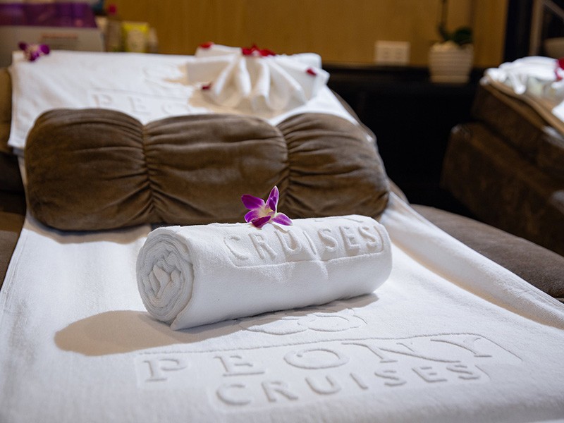 Returning PEONY CRUISE, you can watch the magnificent sunset over the Gulf of Tonkin. Onboard you may join a traditional cooking class. Our chef will instruct you in the making of some Vietnam dishes. In the early evening the boat has its Happy Hour deal Option: Massage service available. Please book with Cruise Manager directly (please see massage menu) |