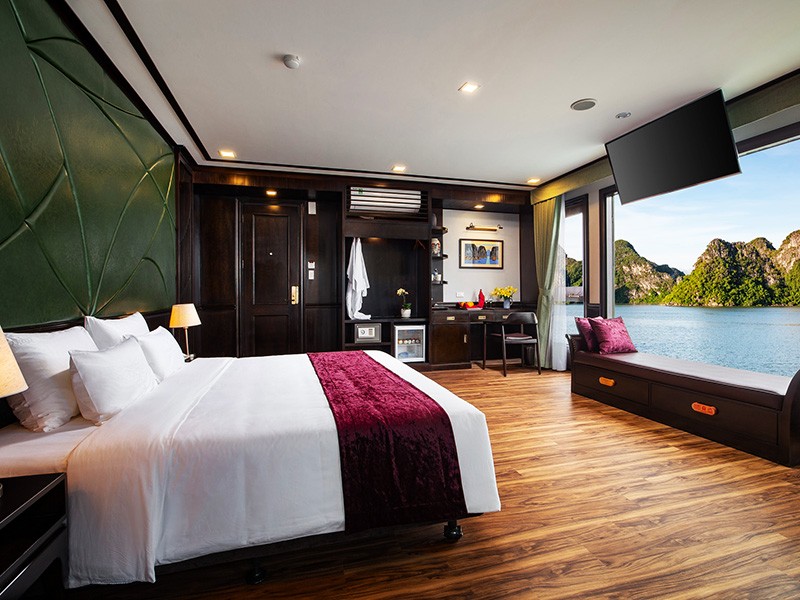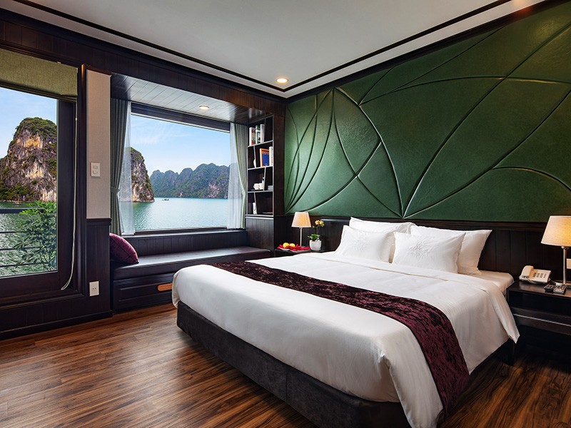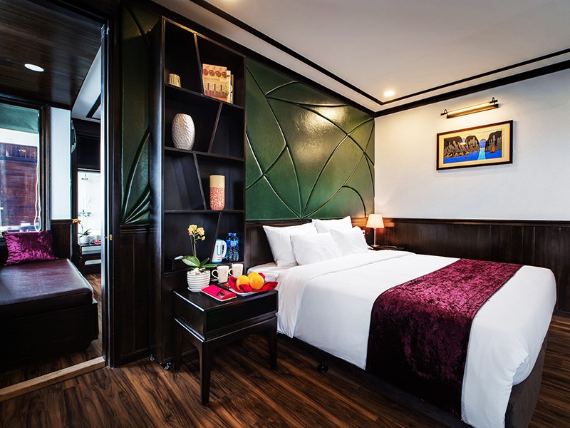 These luxurious cabins are situated on the second floor with private balcony where lovely views of the legend bays are appeared even more beautiful in your eyes once you get into the cabins. Premium Deluxe Cabins are perfectly designed with luxury and elegance. The lifetime experiences are absolutely save in your mind as well as the magnificent cabins are printed as the highlight of your journey in Viet Nam. The plus point of cabins are handmade wooden decoration which curved by the skillful and professional Vietnamese artisans.