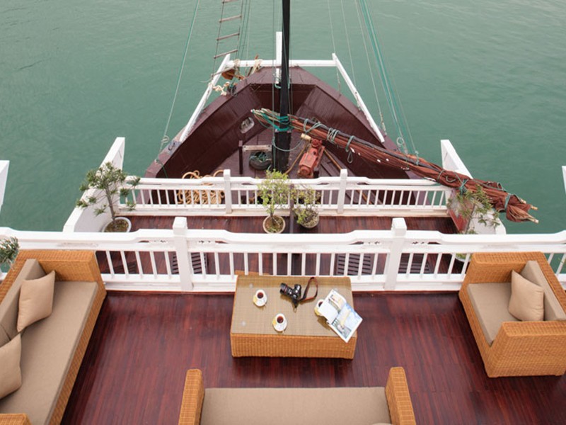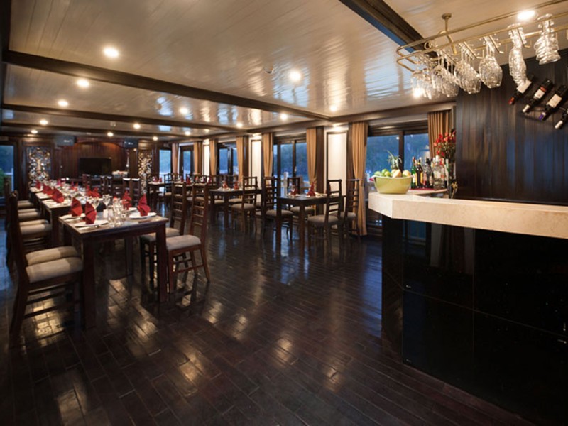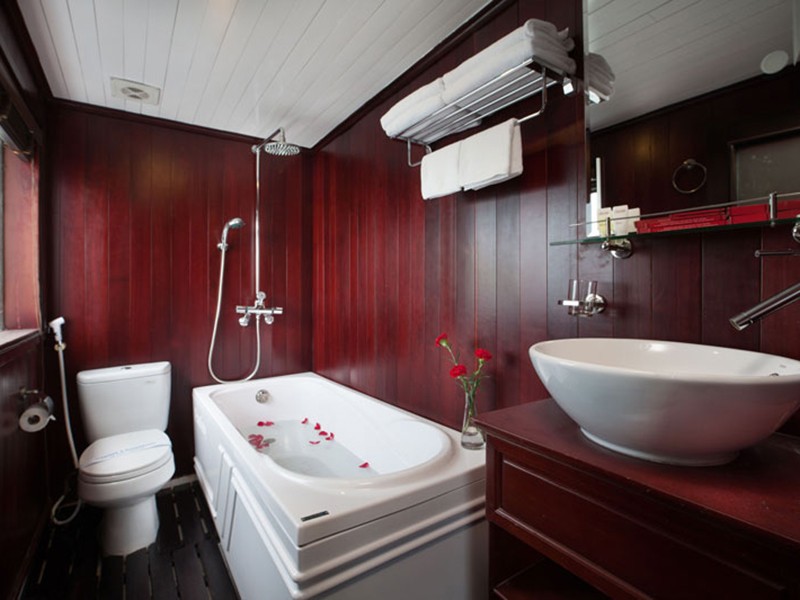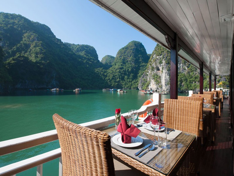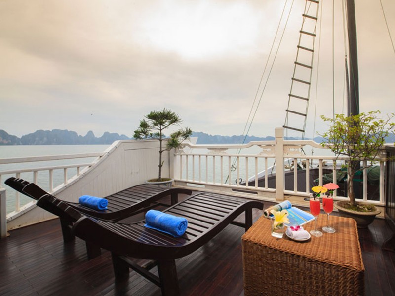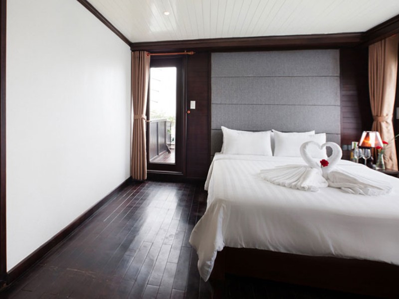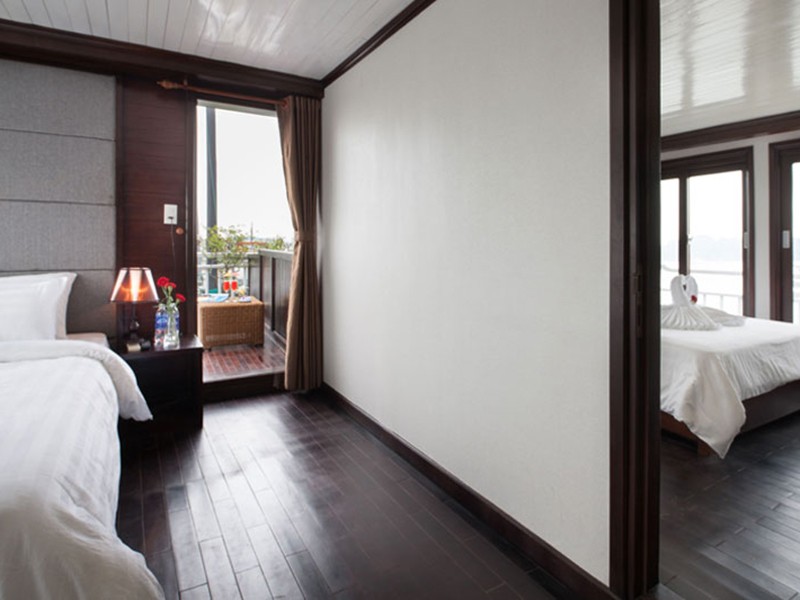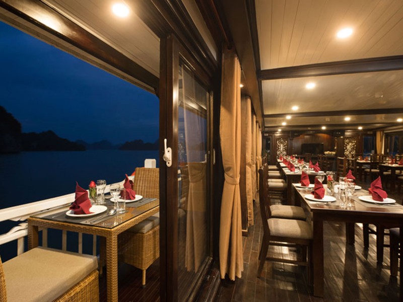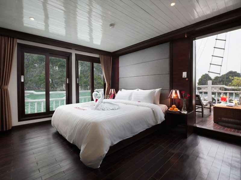 The honeymoon suites are very spacious, located in the front on the second deck, with large private balcony and full length of crystal - clear glass windows at awesome decoration. You can also join the connecting suites with the group booking. A loving choice for your time in Halong bay.