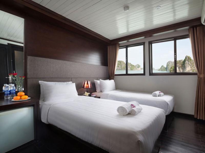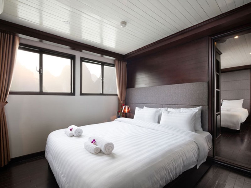 Our deluxe cabins are located on the first deck with windows, offer spacious and comfortable accommodation. The rooms are both double bed and 02 single beds or you can join the connecting rooms with the group booking, that brings you the memorable time in private atmosphere.