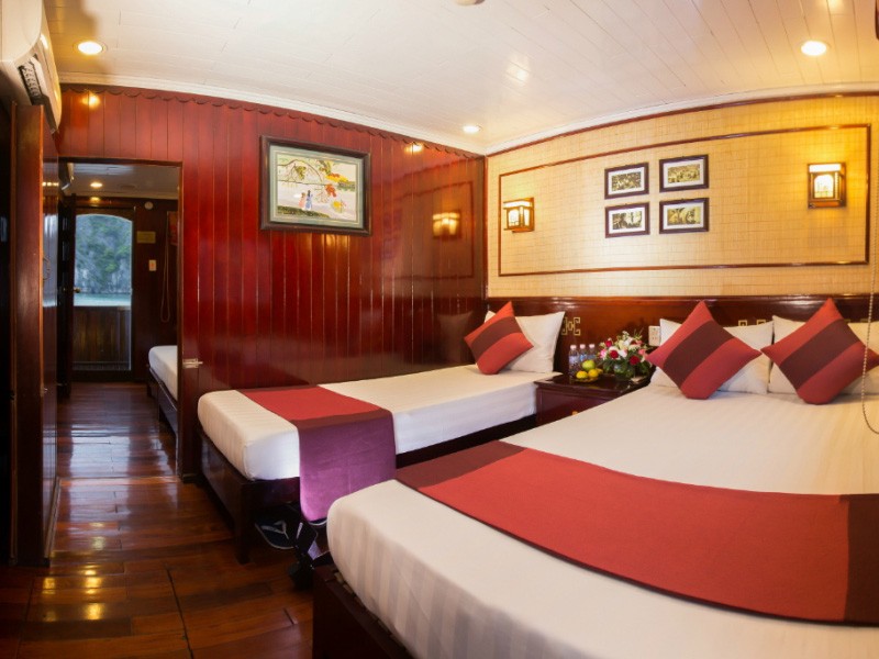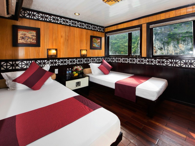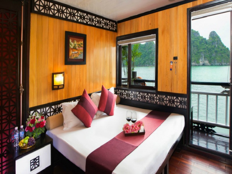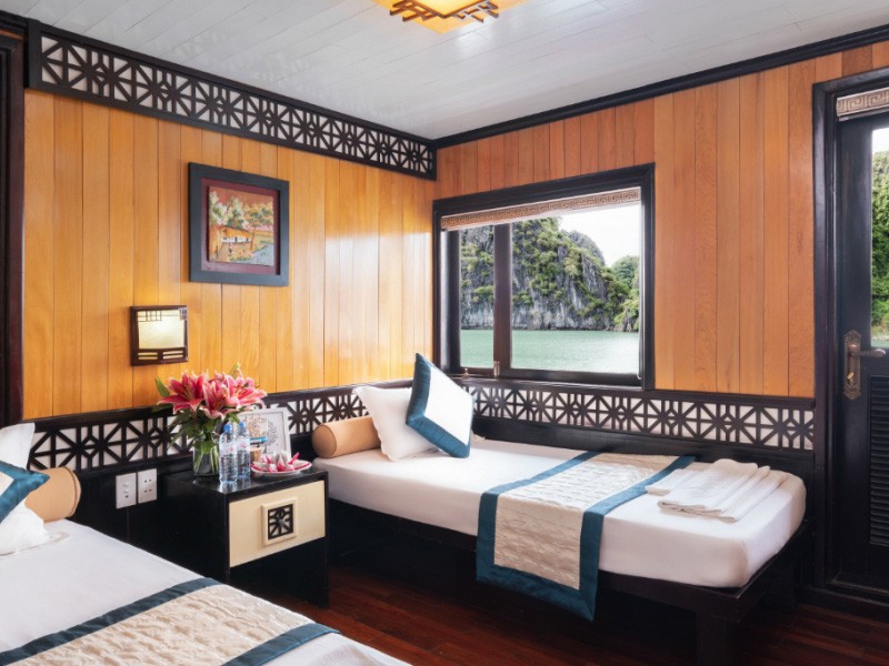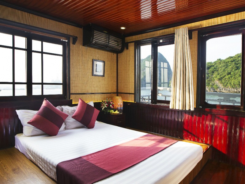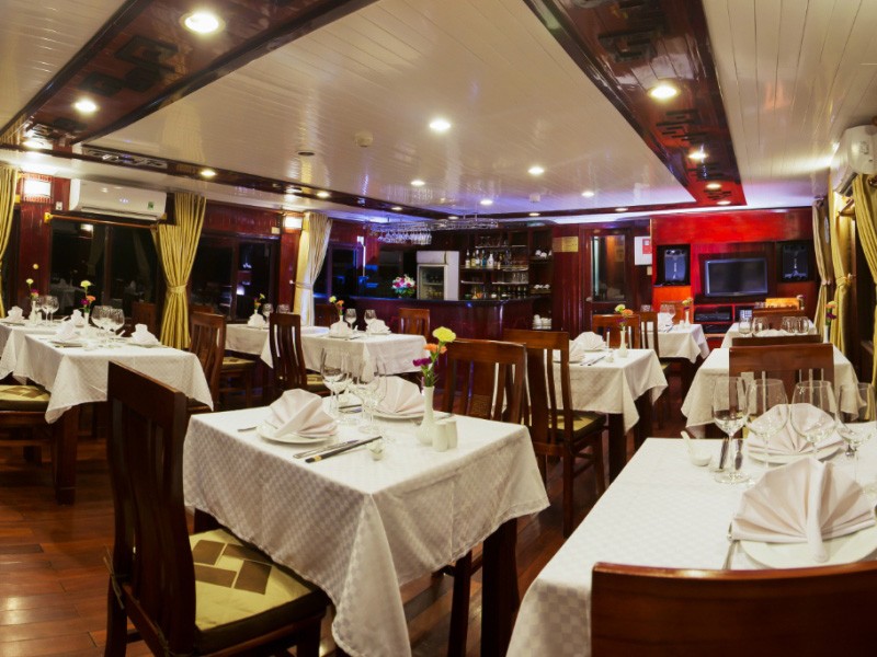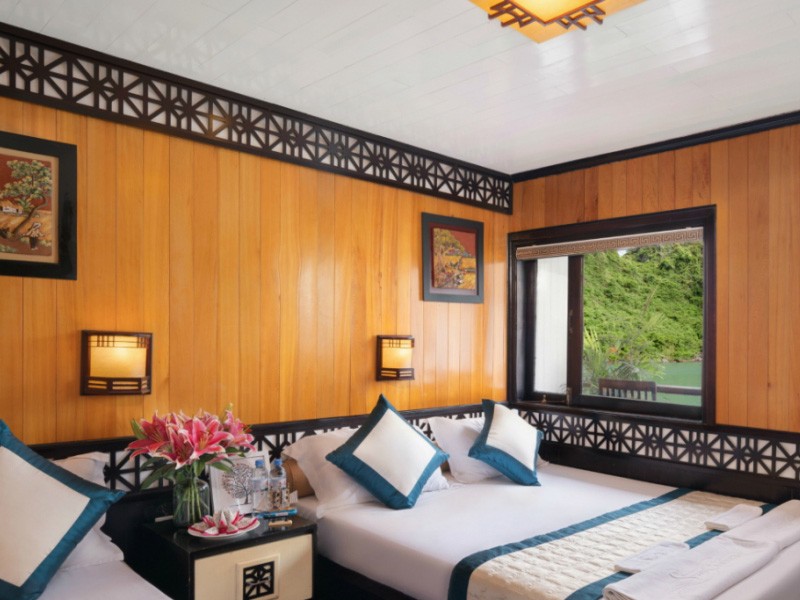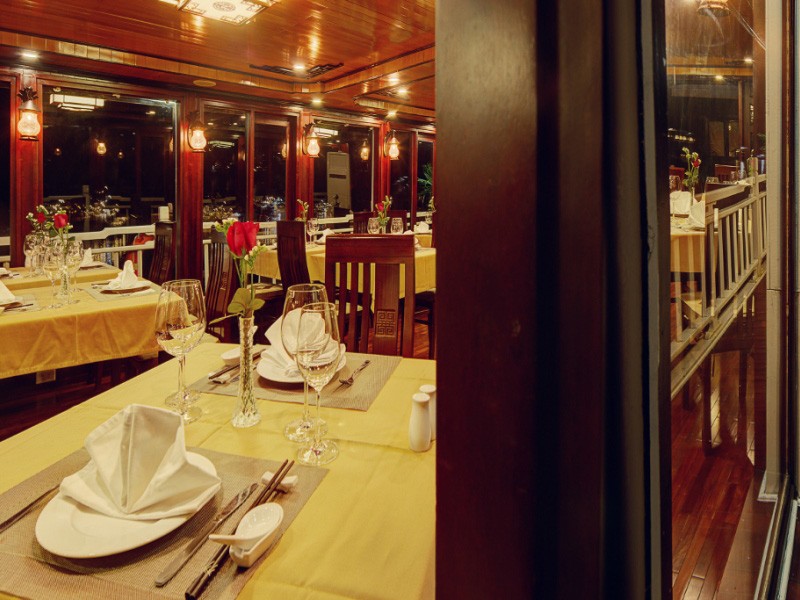 Our eight cabins are designed and fitted international standards, featuring a rich wooden décor, with large windows from which to enjoy the spectacular scenery of Halong Bay. The comfortable bedding with high quality lines ensures you a restful sleep in style.