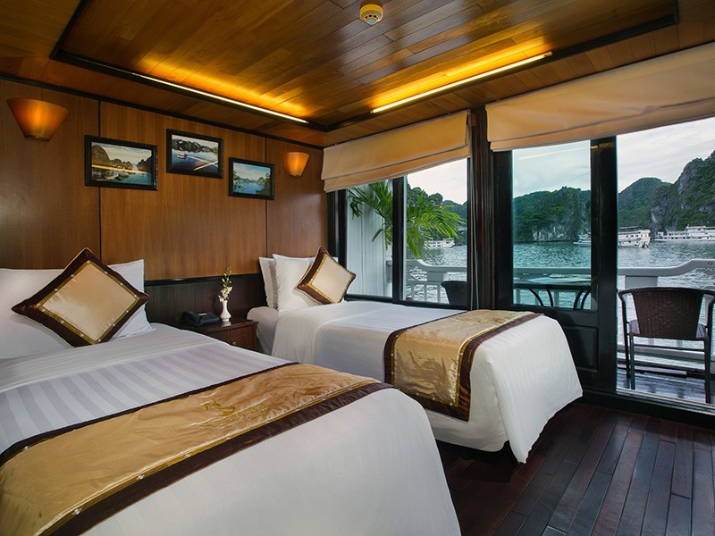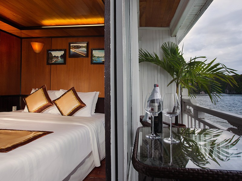 Deluxe Private Balcony Cabin (15m²) offers all the amenities necessary: twin beds or a queen-size bed, air-conditioner, en-suite bathroom with shower. Besides, each cabin features a private balcony with table and chair, providing a relaxing place for you to enjoy the magnificent bay view as well as to savor a private breakfast or afternoon tea.