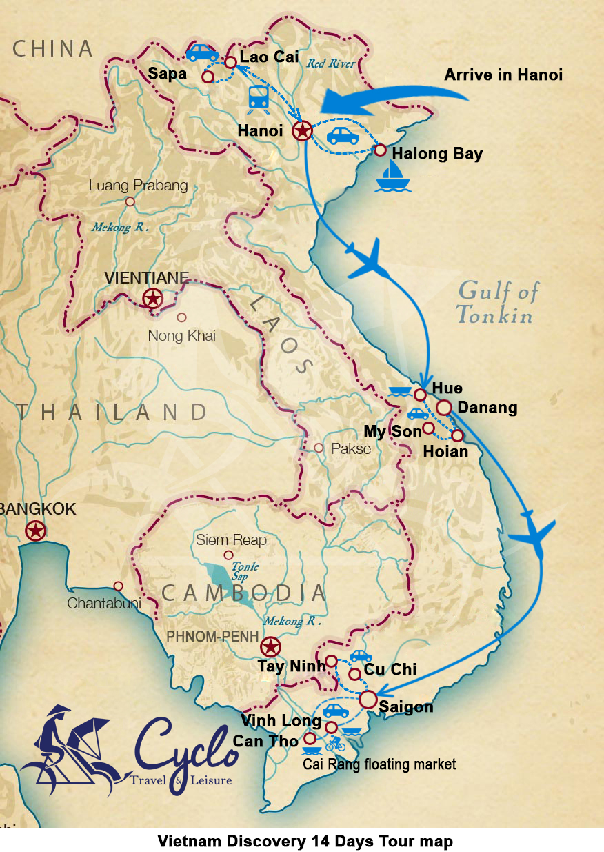 - The Vietnam Discovery tour is your best choice if you want to experience the totality of Vietnam: the land, the people, the culture, and the history, as a Vietnamese person would. In this Vietnam holiday, as you travel through the country you will experience all forms of transport: car, train, airplane, boat, walking and hiking. During 2 weeks traveling with Cyclo Travel & Leisure, you will trace the path of the founding of Vietnam.