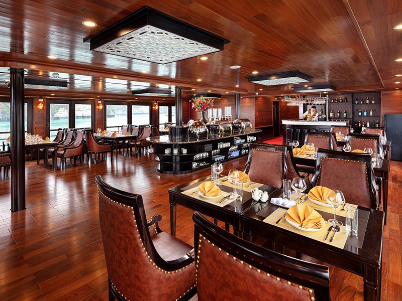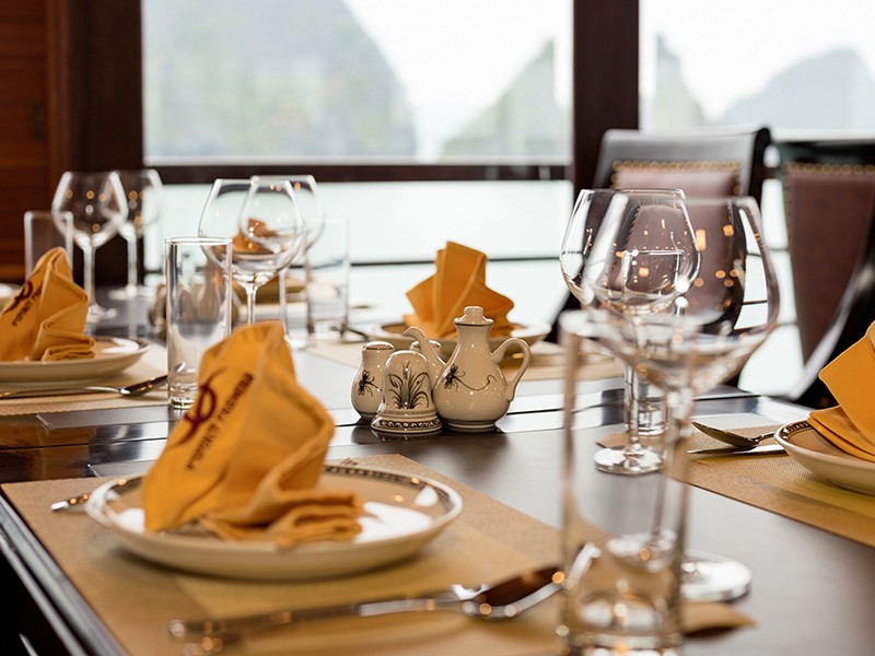 The captain begins our sailing into the evocative world of Lan Ha Bay as we watch through the dining room windows. A wonderful lunch will be served here while we cruise. |